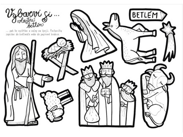 | Jednoduchá vystřihovánka a omalovánka v jednom, určená k přilepení na špejle a k zapíchnutí třeba do květináče. Jde o list papíru ve formátu A4 , kde najdete koníka, kravičku, ovečku, tři krále a Josefa s Marií a Ježíškem. Vše si vybarvěte, vystřihněte a máte roztomilý betlém! |